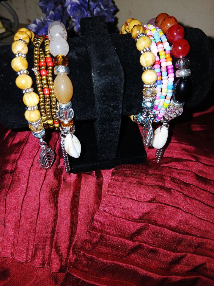 Design: Multi-layered beaded bracelets with a mix of textures and colors